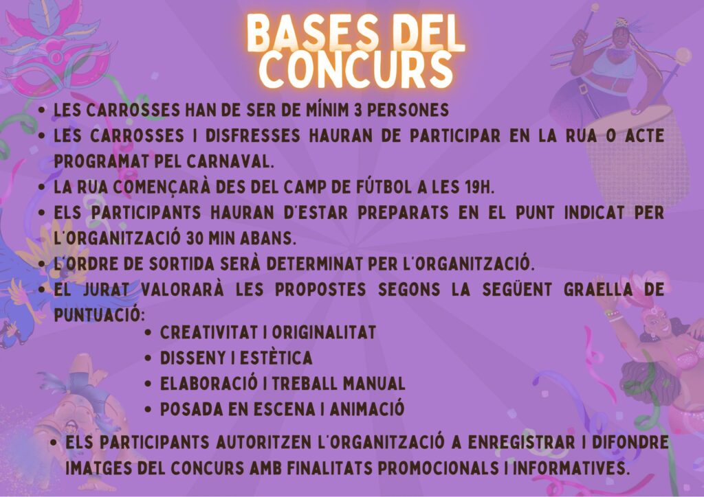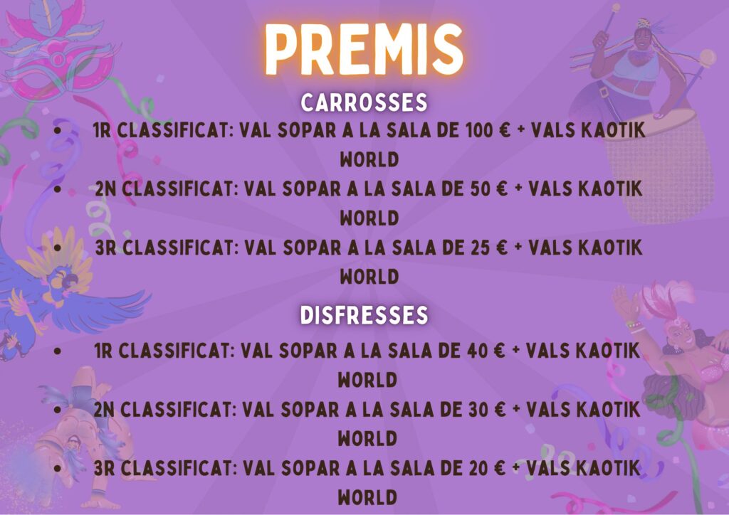 Concurs de carrosses i disfresses. Premis per les 3 millors carrosses, per les 3 millors disfresses i 3 premis infantils.