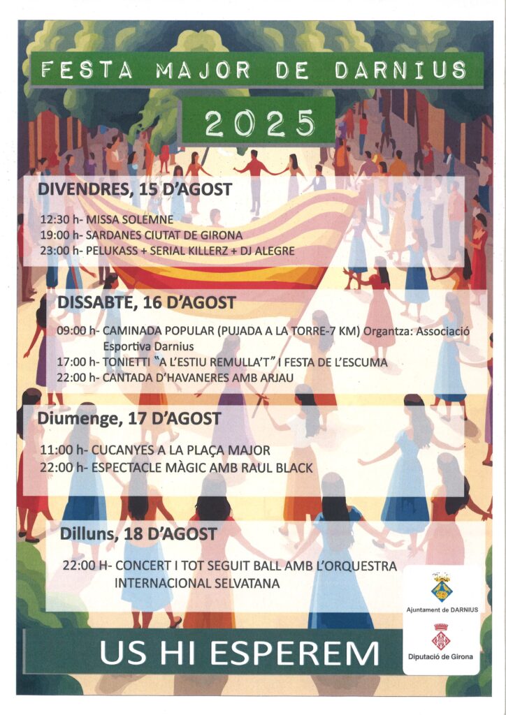 Agenda Festa Major de Darnius Dies 15, 16, 17 i 18 d'agost de 2025 Vine a gaudir de totes les activitats proposades per a la Festa Major. Dies 15, 16, 17 i 18 d’agost Us hi esperem! < Entrada AnteriorEntrada Posterior >