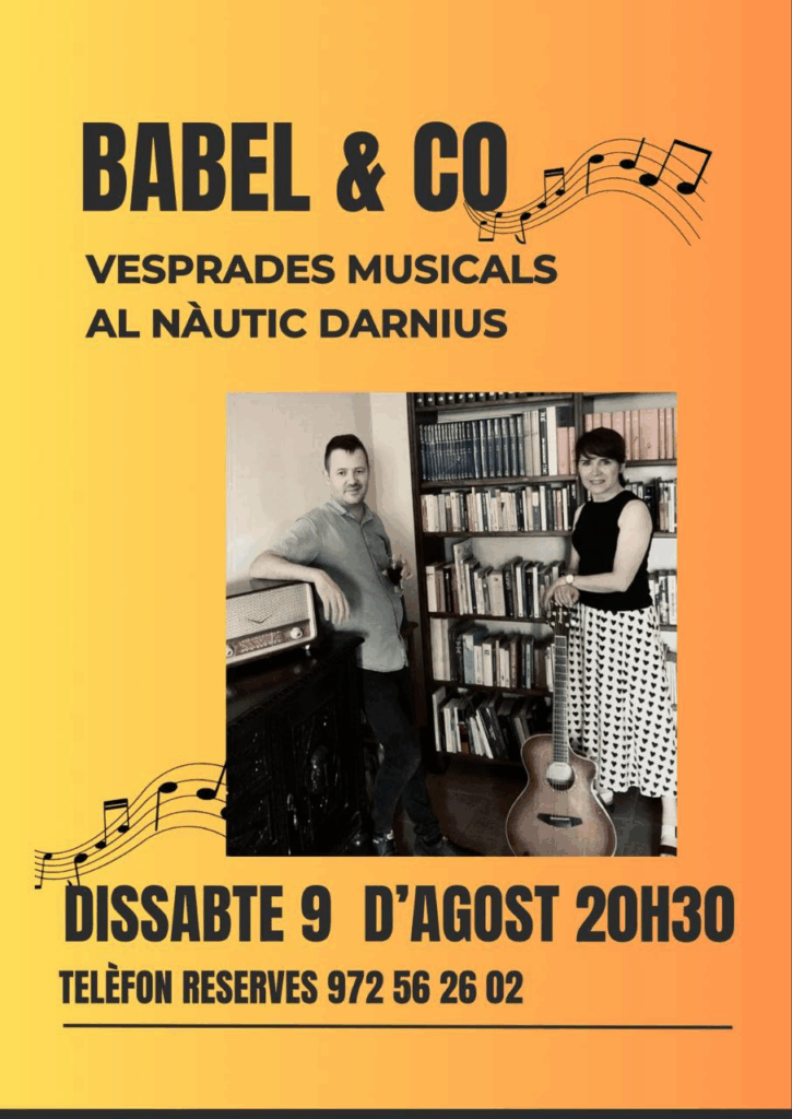 Agenda Vesprades musicals – Babel & Co Dissabte 9 d'agost a les 20.30 h | Nàutic Darnius Vesprades musicals – Babel & Co Dissabte 9 d’agost a les 20.30 h al Nàutic Darnius Telèfon reserves: 972 56 26 02 < Entrada AnteriorEntrada Posterior >